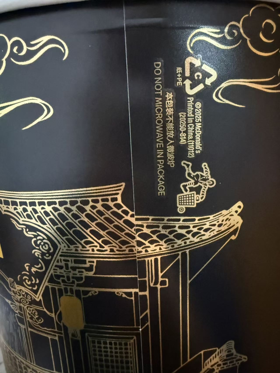 其二,此次新包装的提示以白色或烫金小字的形式出现在花纹附近,几乎与花纹“融为一体”,该包装同时印有醒目字体和图案,映衬之下安全提示十分隐蔽,不仔细观察很难发觉,购物小票和社交媒体上麦当劳官方账号也没有相应的提醒。