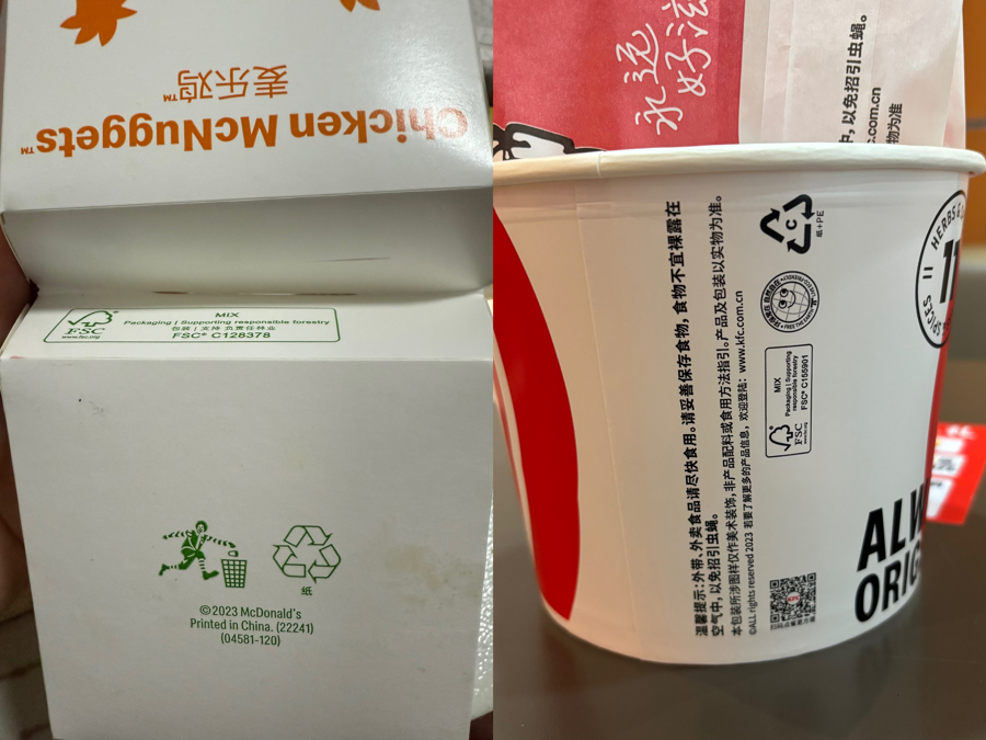 其一,麦当劳此前的包装盒并没有“禁止微波加热”字样,记者此次购买的部分产品的包装盒也沿用旧包装,对比之下有明显不同。而对比同类型产品,肯德基及市面上多家炸物外卖产品采用纸质包装,也没有相应的提示,不少消费者已经习惯以加热旧包装产品的方式微波加热,因此出现多起起火事件。