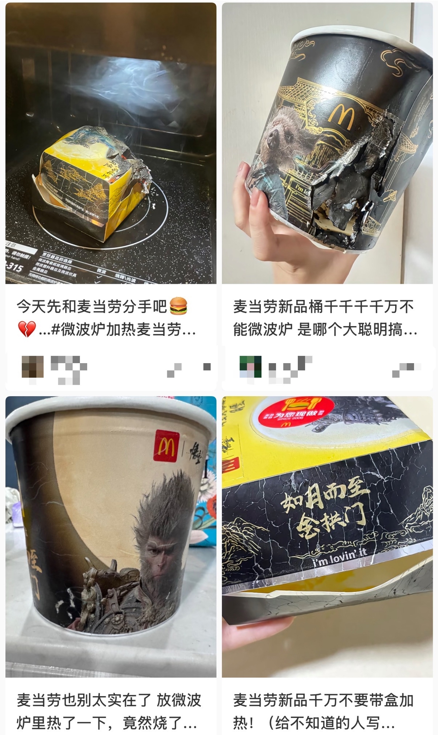 之前的包装都可以微波加热,新包装放进微波炉就起火?记者随即购买了韩先生同款麦当劳产品,此次加热后起火的新包装为麦当劳中秋限定联名款包装,无论是汉堡盒、小食盒还是炸鸡桶,整体色调均为黑色,而在黑色底色上印有不少金色的花纹,封边还有银色材料,推测含有金属物质,因此微波加热会起火。在所有类型的新包装盒侧边都能看到一行小字:“本包装不能放入微波炉。”