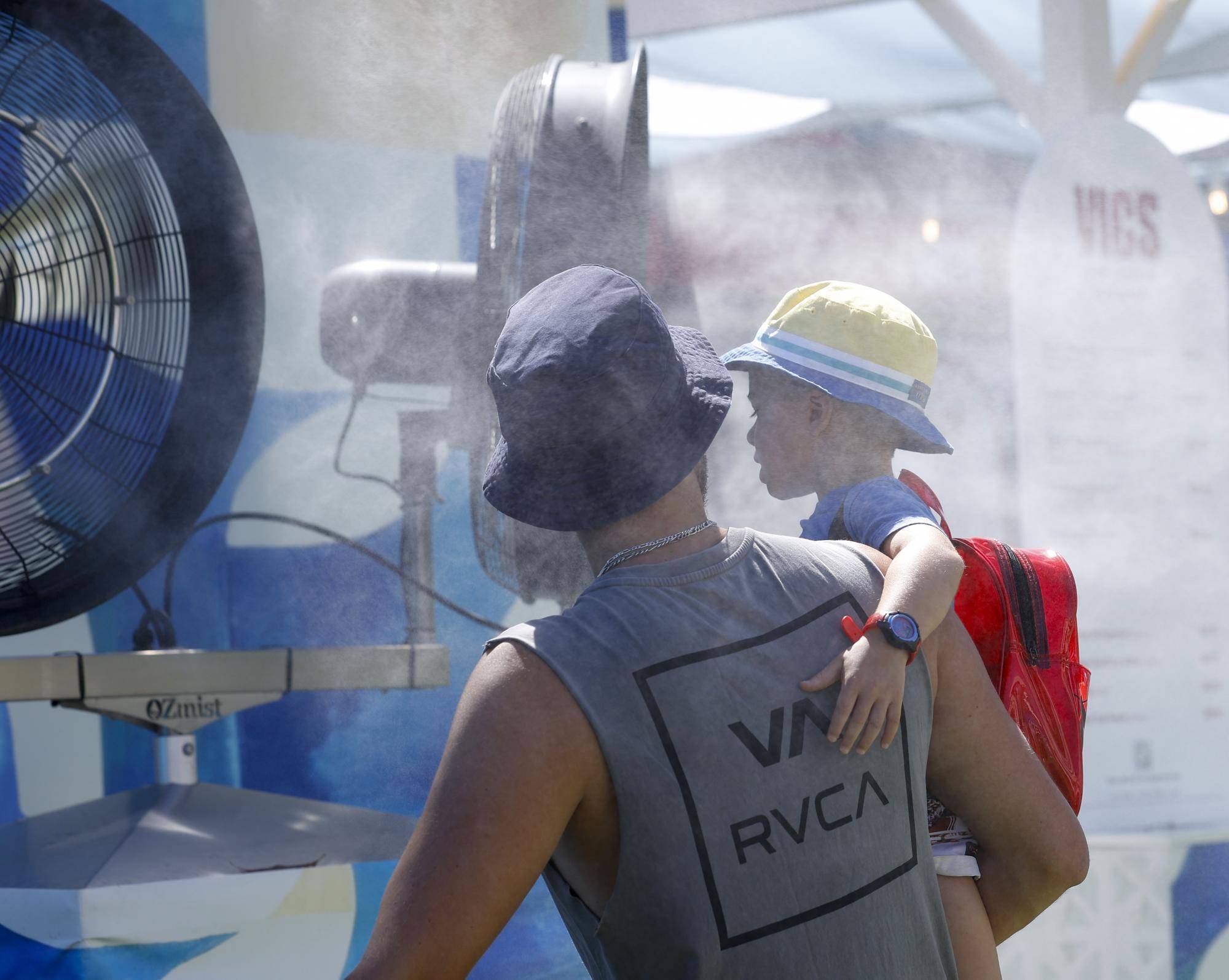 1月24日,人们在澳大利亚墨尔本公园享受风扇吹出的凉风。新华社记者马平摄2026年澳大利亚网球公开赛正在墨尔本举行,赛事主办方启动极端高温天气应对预案,将依据气温变化对室外赛场的比赛安排作出动态调整,并适时关闭场馆顶棚。据《悉尼先驱晨报》报道,澳网室外赛场的比赛被迫暂停。