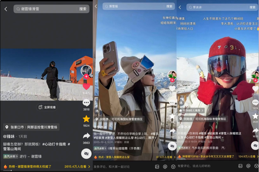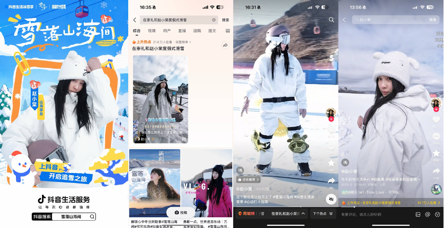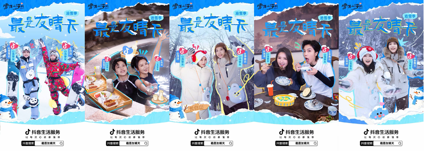 与此同时,北方冰雪旅游持续走俏。抖音生活服务通过明星、文旅机构、商家及达人多维联动,构建“线上种草—线下体验—消费转化”完整链路,将冰雪资源整合为清晰可感的游玩指南。比如,何洁与李霄云的微综艺《最是友晴天·追雪季》全景呈现“滑雪+温泉+UTV穿越+萌宠乐园”多元体验;赵小棠的崇礼Vlog演绎“滑雪+度假”品质玩法;谢霆锋、李冰冰等专业滑雪内容则精准触达冰雪爱好者。